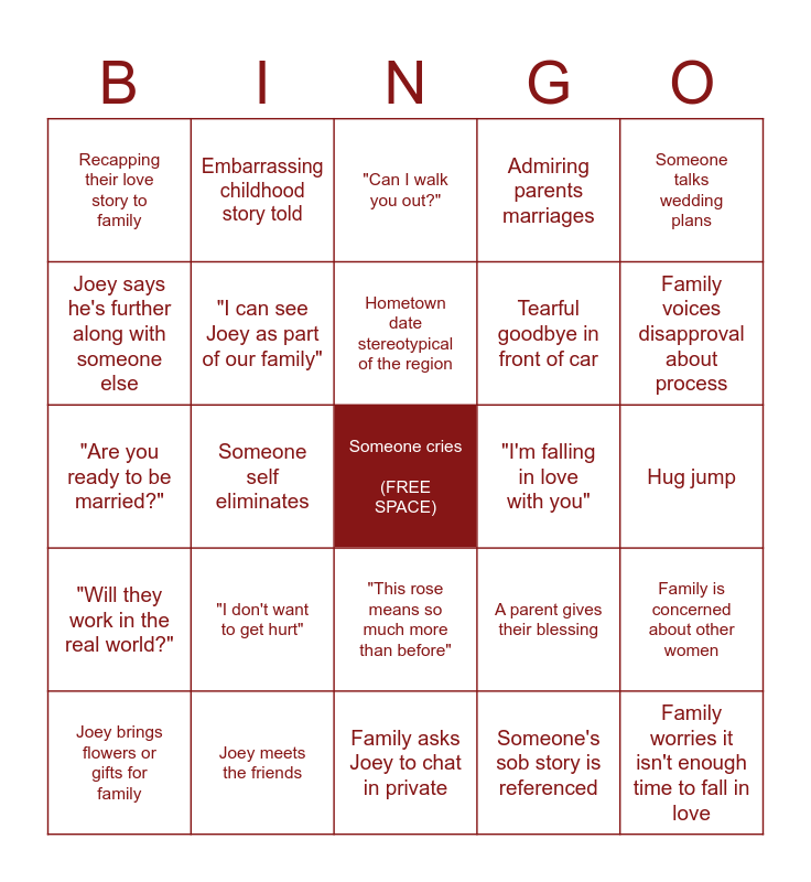 This bingo card has a free space and 28 words: Family is concerned about other women, Dramatic pause before last rose is announced, Tearful goodbye in front of car, Someone's sob story is referenced, Joey says he's further along with someone else, "Can I walk you out?", Embarrassing childhood story told, "Will they work in the real world?", "I'm falling in love with you", Joey brings flowers or gifts for family, "Are you ready to be married?", Admiring parents marriages, Joey meets the friends, Family asks Joey to chat in private, Family voices disapproval about process, Talks about future life / family together, "I don't want to get hurt", "I can see Joey as part of our family", Hometown date stereotypical of the region, "This rose means so much more than before", Recapping their love story to family, Family says "I've never seen you so happy", Family worries it isn't enough time to fall in love, Someone self eliminates, Hug jump, A parent gives their blessing, Someone talks wedding plans and Someone questions how well Joey knows a contestant.