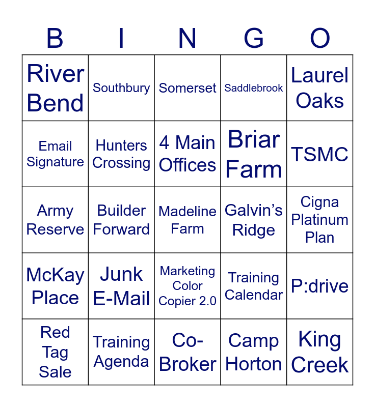 This bingo card has 86 words: Microsoft Teams, Team New Rock Stars, Marketing Color Copier 2.0, Duo Authentication, Ben Lunnen, 1978, Microsoft Dynamics, DHI Central, Easter, Verizon, Sales Representative, Salsa Fresh, P:drive, Cigna Platinum Plan, Mailed, 4 Main Offices, 10 AM, Van Doremalen, DHI Sales, Bi-Weekly, Sales Agreements, Raleigh South, Army Reserve, Meme Girl, Camp Horton, Helpdesk, RRAR, Triad MLS, NCREC, 4:2 Formula, Training Agenda, I-9, Video Shops, Junk E-Mail, Email Signature, Home Builders Association, TSMC, Parade of Homes, DHI Mortgage, Builder Forward, Anderson Farm, Fletcher’s Mill, Olive Branch, Galvin’s Ridge, St. James, Laurel Oaks, Hook Loop Ridge, Southbury, Carriage Place, Varina Gateway, Matthew’s Landing, Woodgrove, McKay Place, Collins Ridge, Carter Ridge, Laurel Ridge, Caroline’s Way, Briar Farm, Saddlebrook, Hunters Crossing, River Bend, Manning Farm, Stanfield, Wheatfield, Granville Trails, Somerset, Bayberry Park, Madeline Farm, King Creek, West New Bern, Fairfield Harbor, Butterfield, Red Tag Sale, Docusign, SOLD!, Commission, Co-Broker, Angel Tree, Employee Referral, MCRAR, Microsoft Surface, Home Is Connected, 5 Star Survey, Sales Rally, Training Calendar and Outlook.