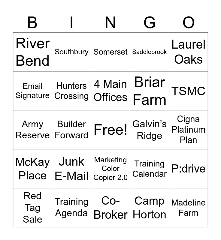 This bingo card has a free space and 86 words: Microsoft Teams, Team New Rock Stars, Marketing Color Copier 2.0, Duo Authentication, Ben Lunnen, 1978, Microsoft Dynamics, DHI Central, Easter, Verizon, Sales Representative, Salsa Fresh, P:drive, Cigna Platinum Plan, Mailed, 4 Main Offices, 10 AM, Van Doremalen, DHI Sales, Bi-Weekly, Sales Agreements, Raleigh South, Army Reserve, Meme Girl, Camp Horton, Helpdesk, RRAR, Triad MLS, NCREC, 4:2 Formula, Training Agenda, I-9, Video Shops, Junk E-Mail, Email Signature, Home Builders Association, TSMC, Parade of Homes, DHI Mortgage, Builder Forward, Anderson Farm, Fletcher’s Mill, Olive Branch, Galvin’s Ridge, St. James, Laurel Oaks, Hook Loop Ridge, Southbury, Carriage Place, Varina Gateway, Matthew’s Landing, Woodgrove, McKay Place, Collins Ridge, Carter Ridge, Laurel Ridge, Caroline’s Way, Briar Farm, Saddlebrook, Hunters Crossing, River Bend, Manning Farm, Stanfield, Wheatfield, Granville Trails, Somerset, Bayberry Park, Madeline Farm, King Creek, West New Bern, Fairfield Harbor, Butterfield, Red Tag Sale, Docusign, SOLD!, Commission, Co-Broker, Angel Tree, Employee Referral, MCRAR, Microsoft Surface, Home Is Connected, 5 Star Survey, Sales Rally, Training Calendar and Outlook.