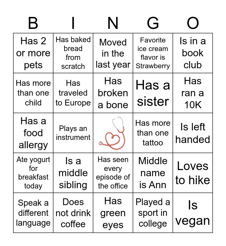 This bingo card has a free space and 29 words: Speak a different language, Has lived out of state, Plays an instrument, Has a December birthday, Has 2 or more pets, Moved in the last year, Has traveled to Europe, Is a middle sibling, Has more than one tattoo, Does not drink coffee, Is left handed, Is vegan, Has green eyes, Played a sport in college, Has ran a 10K, Has more than 5 houseplants, Has seen every episode of the office, Ate yogurt for breakfast today, Is in a book club, Has a food allergy, Middle name is Ann, Favorite color is purple, Has a sister, Has more than one child, Favorite ice cream flavor is Strawberry, Has baked bread from scratch, Loves to hike, Has broken a bone and Has read the "Harry Potter" series.