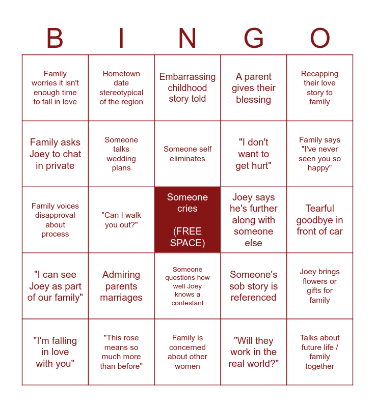 This bingo card has a free space and 28 words: Joey brings flowers or gifts for family, Joey meets the friends, "I don't want to get hurt", "Will they work in the real world?", Family asks Joey to chat in private, Embarrassing childhood story told, Hometown date stereotypical of the region, "I can see Joey as part of our family", Joey says he's further along with someone else, "I'm falling in love with you", Family voices disapproval about process, A parent gives their blessing, "This rose means so much more than before", Family is concerned about other women, Family says "I've never seen you so happy", Dramatic pause before last rose is announced, Admiring parents marriages, Someone talks wedding plans, Someone self eliminates, Someone questions how well Joey knows a contestant, Family worries it isn't enough time to fall in love, "Are you ready to be married?", Talks about future life / family together, "Can I walk you out?", Tearful goodbye in front of car, Someone's sob story is referenced, Recapping their love story to family and Hug jump.
