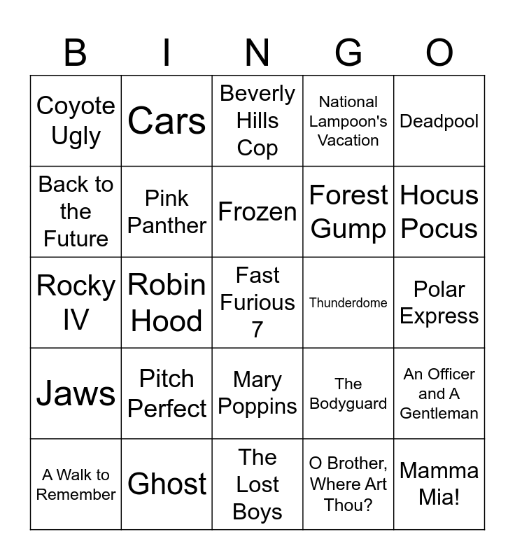 This bingo card has a free space and 27 words: The Bodyguard, Space Jam, Forest Gump, The Lost Boys, Back to the Future, Beverly Hills Cop, Cars, Jaws, Thunderdome, An Officer and A Gentleman, Rocky IV, National Lampoon's Vacation, A Walk to Remember, Ghost, Hocus Pocus, Mission: Impossible, Pink Panther, Frozen, Pitch Perfect, Coyote Ugly, Polar Express, O Brother, Where Art Thou?, Robin Hood, Mamma Mia!, Mary Poppins, Deadpool and The Last Song.
