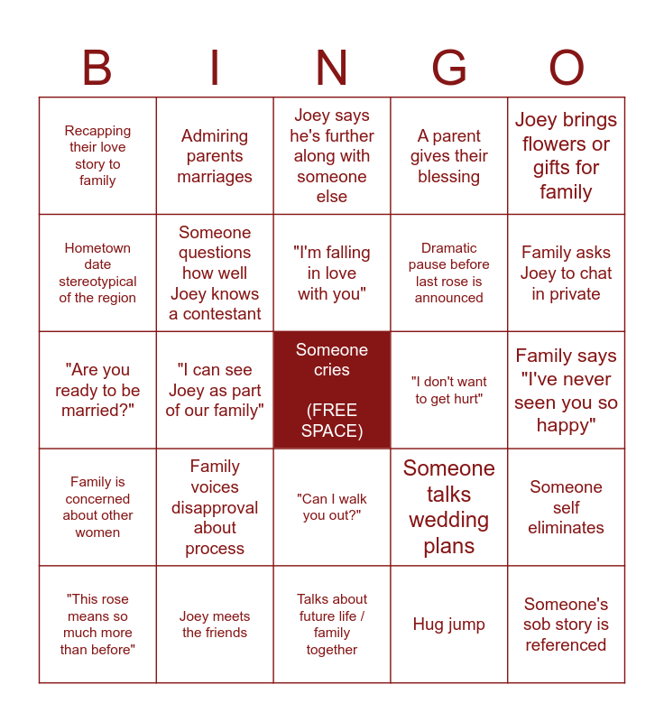 This bingo card has a free space and 28 words: Someone self eliminates, "Will they work in the real world?", Dramatic pause before last rose is announced, Hug jump, Hometown date stereotypical of the region, Joey says he's further along with someone else, Admiring parents marriages, Family is concerned about other women, "I don't want to get hurt", "This rose means so much more than before", "Are you ready to be married?", A parent gives their blessing, Joey meets the friends, Talks about future life / family together, Family asks Joey to chat in private, Family worries it isn't enough time to fall in love, Family voices disapproval about process, Someone questions how well Joey knows a contestant, "I'm falling in love with you", "Can I walk you out?", Recapping their love story to family, Tearful goodbye in front of car, Someone's sob story is referenced, "I can see Joey as part of our family", Family says "I've never seen you so happy", Someone talks wedding plans, Joey brings flowers or gifts for family and Embarrassing childhood story told.