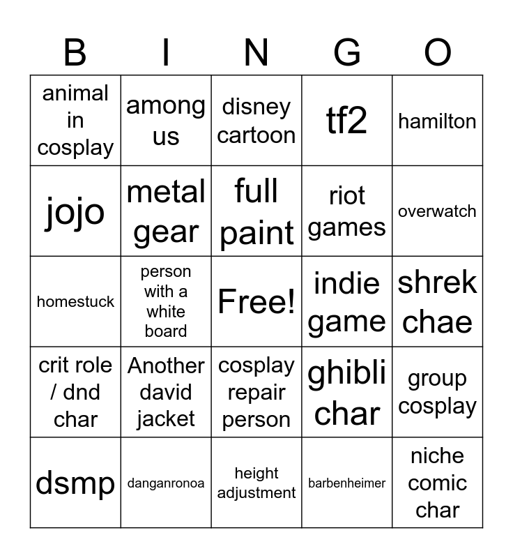 This bingo card has a free space and 24 words: Another david jacket, danganronoa, full paint, dsmp, hamilton, animal in cosplay, jojo, among us, indie game, cosplay repair person, riot games, homestuck, ghibli char, group cosplay, metal gear, barbenheimer, shrek chae, disney cartoon, overwatch, person with a white board, niche comic char, crit role / dnd char, tf2 and height adjustment.