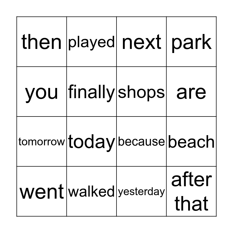 This bingo card has a free space and 15 words: went, after that, next, then, are, you, today, yesterday, finally, tomorrow, beach, park, shops, played and walked.