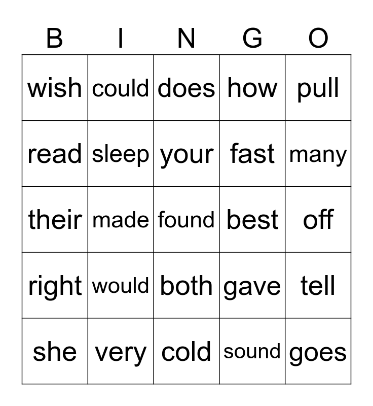 This bingo card has a free space and 24 words: would, very, your, she, pull, wish, read, could, best, both, fast, their, gave, tell, sleep, sound, off, does, many, made, goes, right, how and cold.