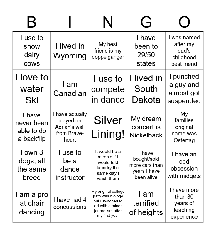 This bingo card has a free space and 28 words: I have an odd obsession with midgets, My dream destination is Greece, I lived in South Dakota, I am terrified of heights, I love to water Ski, My best friend is my doppelganger, I lived in Wyoming, I own 3 dogs, all the same breed, My dream concert is Nickelback, I am a pro at chair dancing, I have never been able to do a backflip, I have been to 29/50 states, I have had 4 concussions, My original college path was biology but I switched to art with a minor journalism after my first year, I punched a guy and almost got suspended, I have never broken a bone, I use to be a dance instructor, I am Canadian, I use to compete in dance, It would be a miracle if I would fold laundry the same day I wash them, I use to show dairy cows, My least favorite color is purple, I have more than 30 years of teaching experience, I have actually played on Adrian's wall from Brave-heart, My families original name was Ostertag, I have bought/sold more cars than years I have been alive, I was named after my dad's childhood best friend and My middle name was actually going to be my first name.