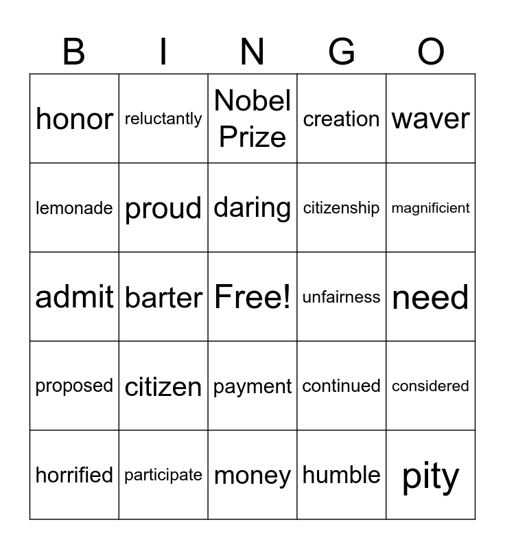 This bingo card has a free space and 25 words: citizen, money, daring, horrified, waver, honor, lemonade, reluctantly, unfairness, payment, citizenship, admit, continued, considered, proud, volunteer, need, Nobel Prize, magnificient, barter, pity, participate, proposed, creation and humble.