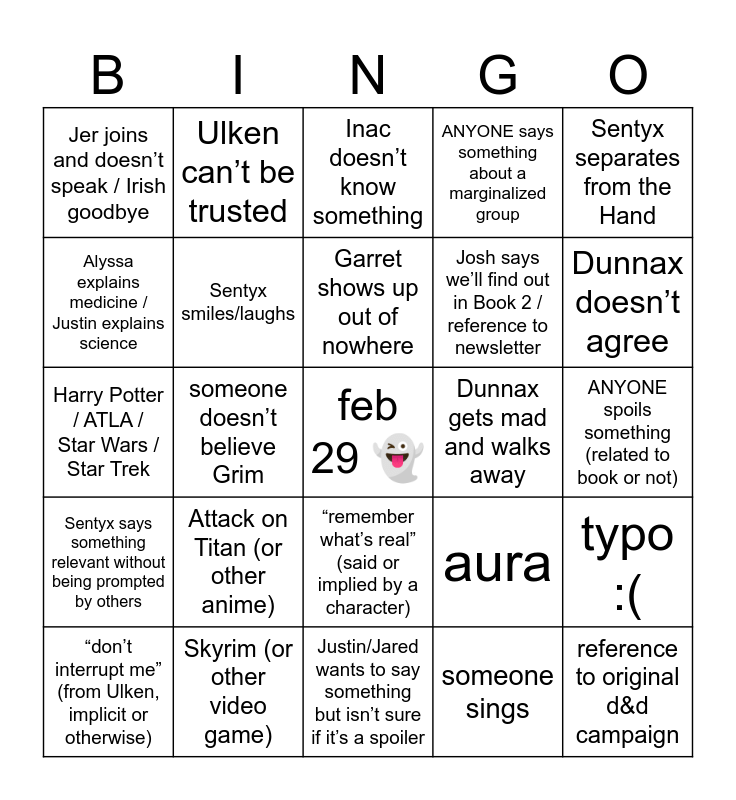 This bingo card has a free space and 33 words: Grim’s ominous one-liner, Grim isn’t good at something, someone doesn’t believe Grim, Sentyx doesn’t respond to someone talking directly to him, Sentyx says something relevant without being prompted by others, Sentyx smiles/laughs, Sentyx separates from the Hand, “don’t interrupt me” (from Ulken, implicit or otherwise), Ulken can’t be trusted, Garret is nosey and/or wants to steal something, Garret shows up out of nowhere, Inac doesn’t know something, Inac is disappointed, Dunnax’s armor, Dunnax gets mad and walks away, Dunnax doesn’t agree, Skyrim (or other video game), Harry Potter / ATLA / Star Wars / Star Trek, Attack on Titan (or other anime), aura, “remember what’s real” (said or implied by a character), reference to water/ocean, Jer joins and doesn’t speak / Irish goodbye, ANYONE spoils something (related to book or not), Justin/Jared wants to say something but isn’t sure if it’s a spoiler, reference to original d&d campaign, ANYONE says something about a marginalized group, Josh says we’ll find out in Book 2 / reference to newsletter, Alyssa explains medicine / Justin explains science, typo :(, Josh spoils something (verbal or visual), someone sings and dictionary check.