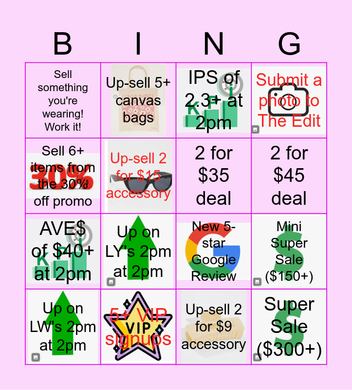 This bingo card has 13 images and 16 words: 5+ VIP signups, Mini Super Sale ($150+), IPS of 2.3+ at 2pm, Sell something you're wearing! Work it!, AVE$ of $40+ at 2pm, Up-sell 5+ canvas bags, New 5-star Google Review, Up-sell 2 for $9 accessory, Sell 6+ items from the 30% off promo, Up-sell 2 for $15 accessory, Up on LW's 2pm at 2pm, Submit a photo to The Edit, Up on LY's 2pm at 2pm, 2 for $45 deal, 2 for $35 deal and Super Sale ($300+).