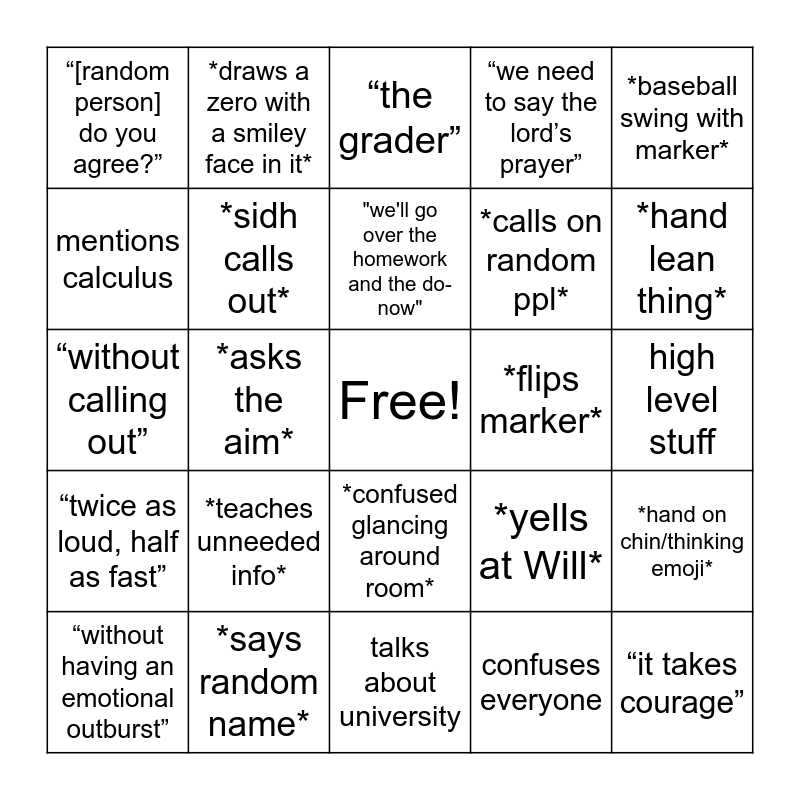 This bingo card has a free space and 29 words: “without having an emotional outburst”, “It’s a free country”, *asks the aim*, *out of pocket analogy*, “[random person] do you agree?”, “the grader”, *sidh calls out*, *teaches unneeded info*, *flips marker*, *says random name*, high level stuff, “it takes courage”, talks about university, confuses everyone, *hand lean thing*, *baseball comment*, *confused glancing around room*, “twice as loud, half as fast”, *baseball swing with marker*, “without calling out”, *yells at Will*, “high level”, *calls on random ppl*, mentions calculus, “we need to say the lord’s prayer”, *draws a zero with a smiley face in it*, *hand on chin/thinking emoji*, "we'll go over the homework and the do-now" and "the grader is very sensitive".