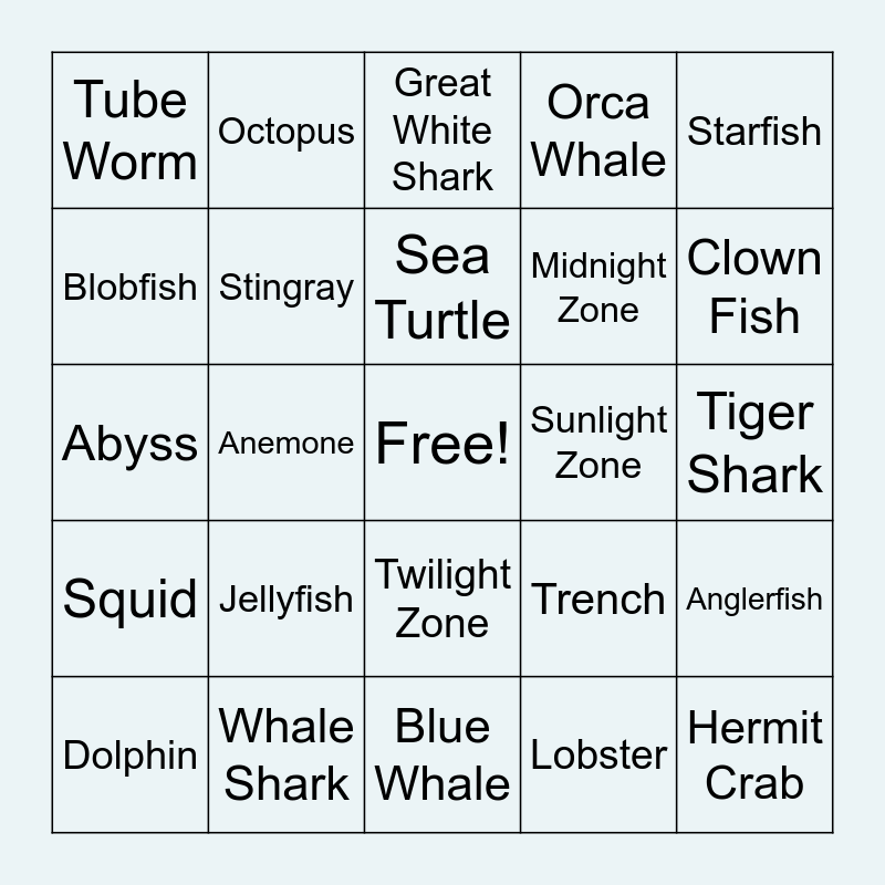 This bingo card has a free space and 24 words: Jellyfish, Whale Shark, Sea Turtle, Dolphin, Starfish, Tube Worm, Blobfish, Octopus, Sunlight Zone, Twilight Zone, Midnight Zone, Abyss, Trench, Anglerfish, Stingray, Lobster, Tiger Shark, Great White Shark, Clown Fish, Anemone, Hermit Crab, Squid, Orca Whale and Blue Whale.