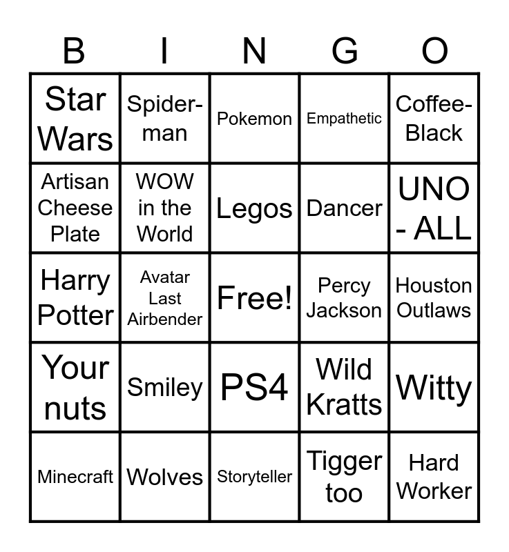 This bingo card has a free space and 64 words: NFL, March Madness, Overwatch, Witty, Funny, Favorite Color Black, Spider-man, Batman, Legos, Rocket League, PS4, Reaper, Houston Outlaws, Coffee-Black, Pizza - Olives Mushrooms, Artisan Cheese Plate, Avatar Last Airbender, Star Wars, Musical, Dancer, Smiley, Your nuts, Empathetic, Happy, Best Day Ever, Mac n Cheese, Expendables, Twilight Movies, Cars 1 2 and 3, Sweet, Good Friend, Kind, Rabbit Pabbit Shabbit, Teenage Mutant Ninja Turtles, UNO - ALL, Minecraft, Winnie-the-Pooh, Tigger too, Story Pirates, WOW in the World, Harry Potter, Percy Jackson, Red Pyramid, Lord of the Rings, Adventurous, Hard Worker, Wolves, Chatty, Wild Kratts, Doctor Doolittle, Brave, Smart, Storyteller, Jokester, Enthusiastic, Fast Learner, Pokemon, Charzard, Pikachu, Skateboarding, League of Legends, Lego Ninjago, Marvel Heroes and Alaska RV Roadtrip.