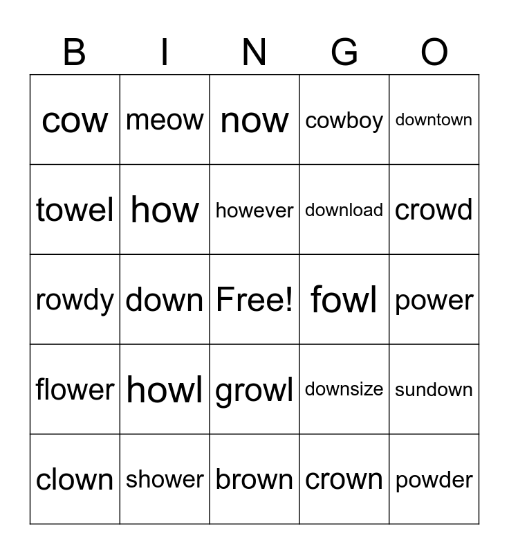 This bingo card has a free space and 29 words: clown, drown, down, frown, cow, now, how, howl, fowl, shower, power, powder, brown, crown, crowd, tower, growl, flower, downtown, rowdy, downsize, chowder, download, towel, cowboy, meow, sundown, however and endow.