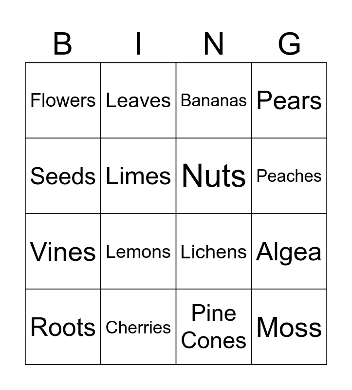 This bingo card has 20 words: Algea, Apples, Bananas, Berries, Roots, Seeds, Cherries, Flowers, Vines, Leaves, Lemons, Lichens, Limes, Moss, Nuts, Oranges, Peaches, Pears, Pine Cones and Pods.