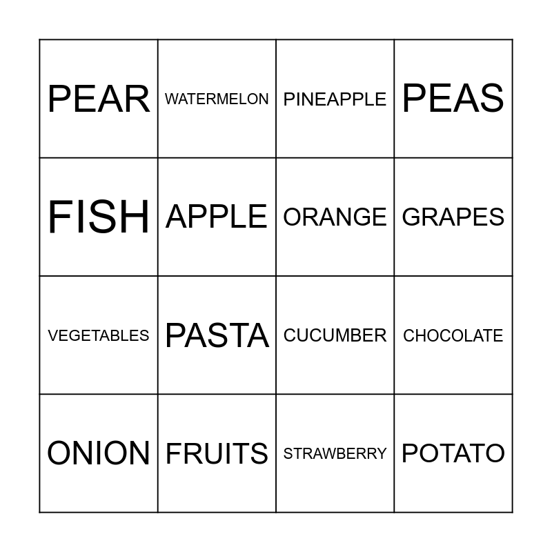 This bingo card has 16 words: FRUITS, CHOCOLATE, PINEAPPLE, PEAR, VEGETABLES, WATERMELON, CUCUMBER, STRAWBERRY, FISH, APPLE, ONION, PEAS, PASTA, GRAPES, ORANGE and POTATO.