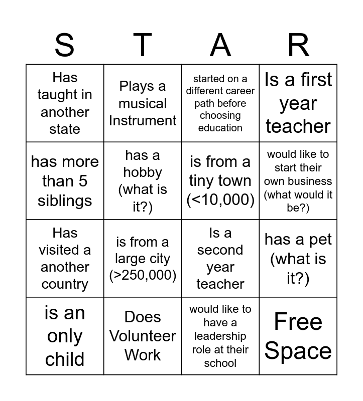This bingo card has 16 words: Does Volunteer Work, has a pet (what is it?), started on a different career path before choosing education, Has taught in another state, Has visited a another country, Plays a musical Instrument, Is a second year teacher, would like to have a leadership role at their school, has more than 5 siblings, has a hobby (what is it?), is an only child, Is a first year teacher, is from a large city (>250,000), would like to start their own business (what would it be?), is from a tiny town (<10,000) and Free Space.