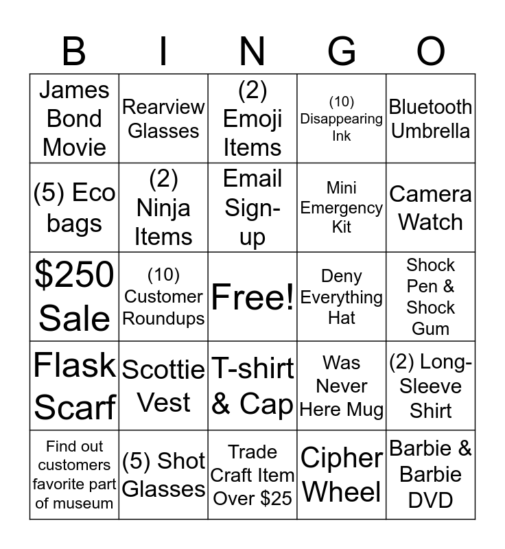 This bingo card has a free space and 24 words: Scottie Vest, (5) Shot Glasses, Email Sign-up, Find out customers favorite part of museum, Bluetooth Umbrella, James Bond Movie, (5) Eco bags, Rearview Glasses, Deny Everything Hat, T-shirt & Cap, Mini Emergency Kit, $250 Sale, Was Never Here Mug, (2) Long-Sleeve Shirt, (2) Ninja Items, Cipher Wheel, Shock Pen & Shock Gum, (2) Emoji Items, Camera Watch, (10) Customer Roundups, Barbie & Barbie DVD, Flask Scarf, (10) Disappearing Ink and Trade Craft Item Over $25.