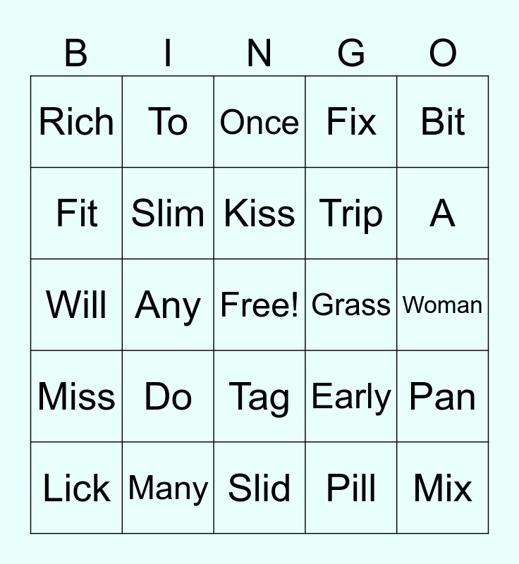 This bingo card has a free space and 34 words: Latch, Pill, The, Brick, Miss, Slim, Bit, Lick, To, Been, Kiss, Once, Pat, Sal, Grass, A, Many, Will, Do, Early, Tag, Bill, Rich, Woman, Slid, Mix, Fix, Lax, Trip, Fit, Earth, Any, Pan and Than.