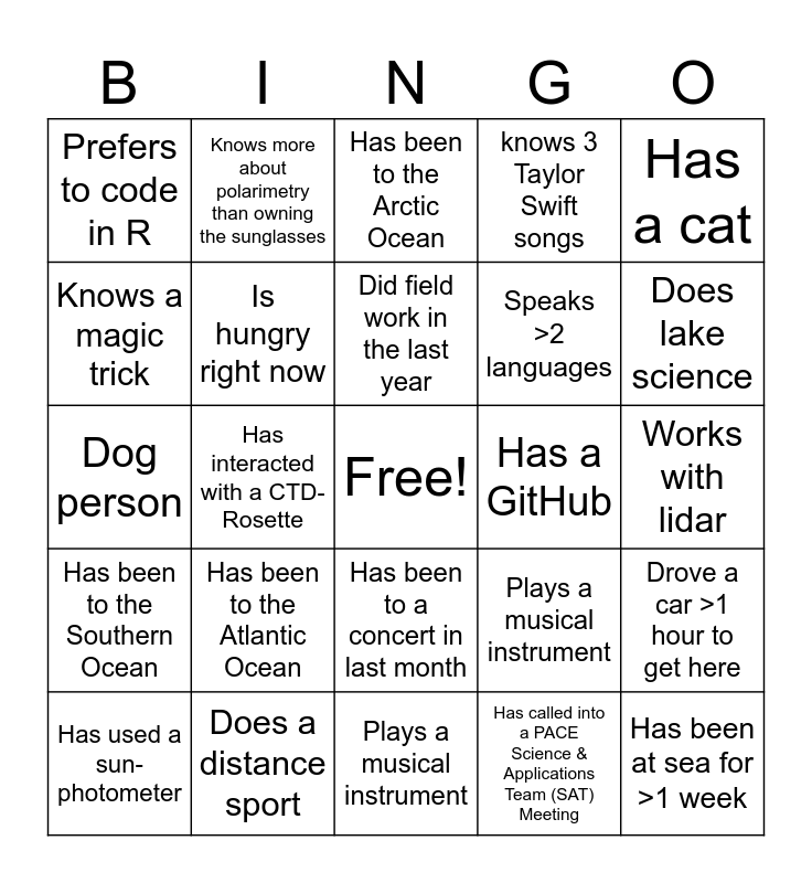 This bingo card has a free space and 53 words: Is an atmospheric scientist, Has been at sea for >1 week, Flies drones, Has called into a PACE Science & Applications Team (SAT) Meeting, Has been to the Atlantic Ocean, Has been to the Pacific Ocean, Knows more about polarimetry than owning the sunglasses, Prefers to code in MATLAB, Knows a magic trick, Moved house within the last year, Is hungry right now, Flew here on a plane, Drove a car >1 hour to get here, Plays a musical instrument, Scuba dives, Has used a sun-photometer, Did field work in the last year, Has a GitHub, Has a dog, Has a cat, Has interacted with a CTD-Rosette, Lives >2 hours drive to the ocean, Speaks >2 languages, Prefers to code in R, Can tell a field work disaster story, Does a distance sport, Star wars fan, Has worked in a clean lab (on land or on a ship), Writes wikipedia articles, Does lake science, Works with citizen scientists, Knows what a sundog is, Climber, Does NOT like to teach but has to, Does a lot of outreach, Models (data or fashion), knows 3 Taylor Swift songs, Plays a musical instrument, Has been to the Arctic Ocean, Has used a weather balloon, Has done airborne science, Has considered becoming an astronaut, Works with lidar, Works with radar, Prefers to code in python, Has been to a concert in last month, Has been at sea for >1 week, Does not like pizza, Dog person, Has been to the Southern Ocean, Filters a lot of seawater, Loves aerosols and Knows what a sundog is.
