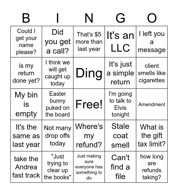This bingo card has a free space and 24 words: Not many drop offs today, "Just trying to clear up the books", Ding, take the Andrea fast track, I left you a message, Could I get your name please?, is my return done yet?, Did you get a call?, I'm going to talk to Elvis tonight, Where's my refund?, It's just a simple return, My bin is empty, Stale coat smell, What is the gift tax limit?, I think we will get caught up today, Can't find a file, Amendment, That's $5 more than last year, client smells like cigarettes, Easter bunny puked on the board, how long are refunds taking?, It's the same as last year, It's an LLC and Just making sure everyone has something to do.
