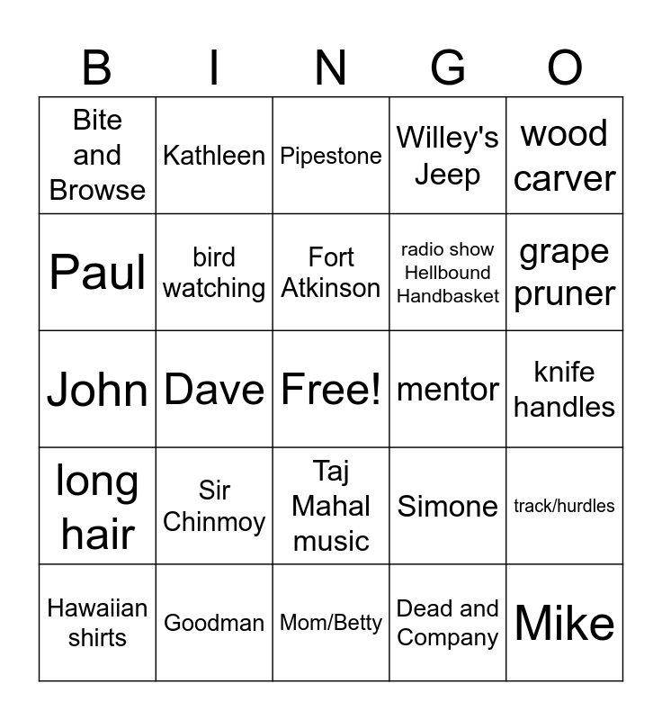 This bingo card has a free space and 77 words: Alan, 1950 pick up truck, Pipestone, Henry, May 4, 1959, July 21, 1994, Loveland, CO, Glenn, Kandice, Hiking, Lauren, Young Americans for Freedom, Fort Atkinson, Paul, Mountains, Dave, photography, Mike, thinker, wood carver, Grateful Dead, John, bird watching, Kathleen, Willey's Jeep, TJ, Clear Lake, CA, debating, Kaile, Dairy of Anne Frank, Liz, grape picker, whistling, Simone, grape pruner, radio show Hellbound Handbasket, Hunting, Buddy Guy, knife handles, Dead and Company, Rodin, tools, High School Librarian, Harriett Moore, all wooden golf putter, Houdon, Hawaiian shirts, Bite and Browse, tie dye, Milton Nasciemento, Impressionist painting, Taj Mahal music, Jerry Garcia, art nouveau jewelry, Gato Barbieri, art pottery, John Lee Hooker, arts and crafts jewelry, Eric Clapton, YCC, Youth Conservation Core, Sir Chinmoy, Parrhesia Boldness = Freedom of Speech, Djavan, Wizard of Oz- Scarecrow, lifeguard @ Hickory Hills, wrestling, cross country runner, mentor, tutor, substitute Dad, skiing, track/hurdles, long hair, Goodman, 430 Whitewater Avenue, Mom/Betty and Dad/Howie.