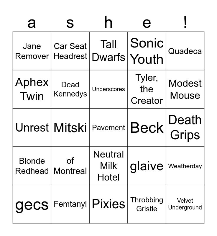 This bingo card has a free space and 24 words: of Montreal, Femtanyl, Underscores, gecs, Quadeca, Jane Remover, Aphex Twin, Car Seat Headrest, Beck, Neutral Milk Hotel, Tyler, the Creator, Unrest, glaive, Weatherday, Dead Kennedys, Throbbing Gristle, Death Grips, Tall Dwarfs, Modest Mouse, Mitski, Velvet Underground, Blonde Redhead, Sonic Youth and Pixies.