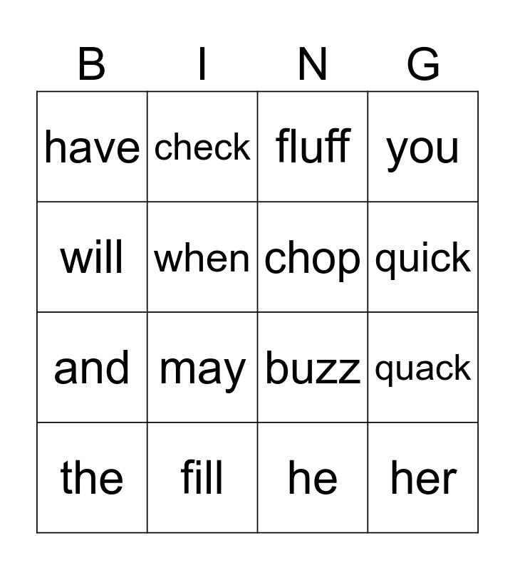 This bingo card has 54 words: they, her, was, some, are, that, you, of, when, little, have, make, with, one, yes, like, the, and, my, he, shell, bell, fill, will, yell, check, chick, pass, mess, fuss, less, pill, puff, cuff, fluff, jazz, buzz, fizz, chat, chop, shed, ship, shop, shack, tuck, sick, dock, pick, quick, quack, may, day, say and kick.