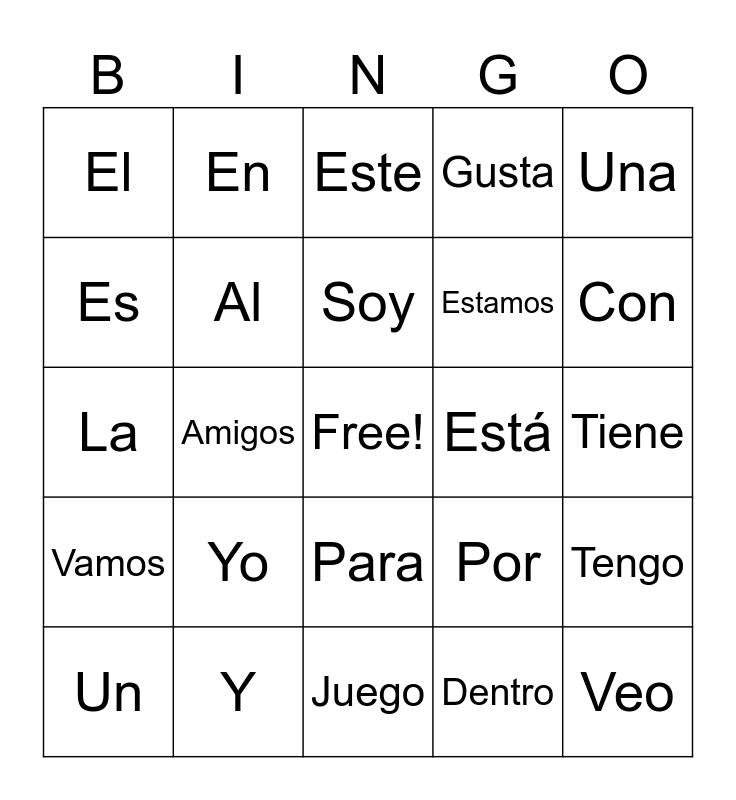 This bingo card has a free space and 24 words: Yo, Y, Soy, Un, Una, El, Es, En, Está, Para, Estamos, La, Por, Tengo, Al, Dentro, Tiene, Este, Con, Amigos, Veo, Vamos, Gusta and Juego.