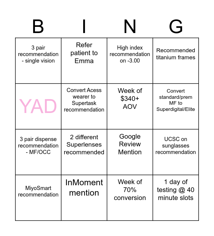 This bingo card has 16 words: InMoment mention, UCSC on sunglasses recommendation, High index recommendation on -3.00, 3 pair recommendation - single vision, 3 pair dispense recommendation - MF/OCC, Refer patient to Emma, Google Review Mention, Week of 70% conversion, YAD, Convert Acess wearer to Supertask recommendation, MiyoSmart recommendation, Recommended titanium frames, 2 different Superlenses recommended, Convert standard/prem MF to Superdigital/Elite, Week of $340+ AOV and 1 day of testing @ 40 minute slots.