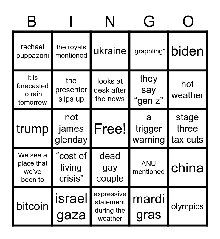This bingo card has a free space and 30 words: israel gaza, albo makes an appearance, not james glenday, disability + sport, rachael puppazoni, ukraine, the presenter slips up, dead gay couple, a trigger warning, expressive statement during the weather, stage three tax cuts, olympics, mardi gras, james glenday asks for weather pics, hot weather, women’s sport before men’s, ANU mentioned, We see a place that we’ve been to, “cost of living crisis”, biden, trump, india reference, the royals mentioned, they say “gen z”, it is forecasted to rain tomorrow, “grappling”, china, bitcoin, looks at desk after the news and asbestos.