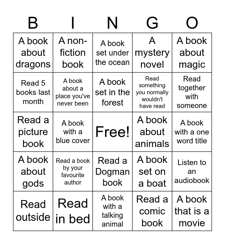 This bingo card has a free space and 24 words: Read a book by your favourite author, Read in bed, A book set in the forest, Read outside, A book about magic, A book about dragons, Read 5 books last month, A non-fiction book, A book about animals, Read a Dogman book, Read something you normally wouldn't have read, Read a picture book, A book set on a boat, Listen to an audiobook, A book about a place you've never been, Read a comic book, A book with a one word title, A book set under the ocean, Read together with someone, A book with a blue cover, A book that is a movie, A book about gods, A mystery novel and A book with a talking animal.