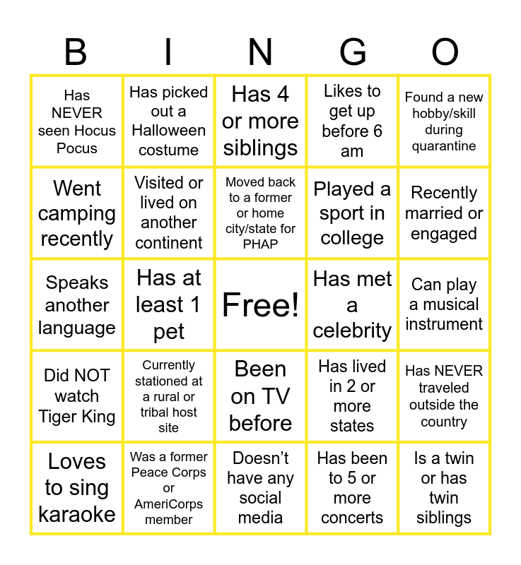 This bingo card has a free space and 40 words: Is assigned outside the continental US for PHAP, Speaks another language, Did NOT have to move for PHAP, Visited or lived on another continent, Was a former Peace Corps or AmeriCorps member, Been on TV before, Moved back to a former or home city/state for PHAP, Currently or formerly in the military, Found a new hobby/skill during quarantine, Did NOT watch Tiger King, Has at least 1 pet, Likes to get up before 6 am, Is a twin or has twin siblings, Can play a musical instrument, Has met a celebrity, Currently stationed at a rural or tribal host site, Is currently NOT working on COVID-19 response, Has NEVER seen Hocus Pocus, Knew a celebrity BEFORE they were famous, Has 4 or more siblings, Has NEVER traveled outside the country, Has been to 5 or more concerts, Played a sport in college, Went camping recently, Has hosted a virtual Happy Hour, Can drive a manual car, Can knit or quilt, Has broken 2 or more bones, Has never been on a plane, Never swears, Failed your first driving test, Loves to sing karaoke, Graduated high school early, Has lived in 2 or more states, Recently married or engaged, Doesn’t have any social media, Has read a good book recently, Loves true crime shows or podcasts, Has picked out a Halloween costume and Is an only child.
