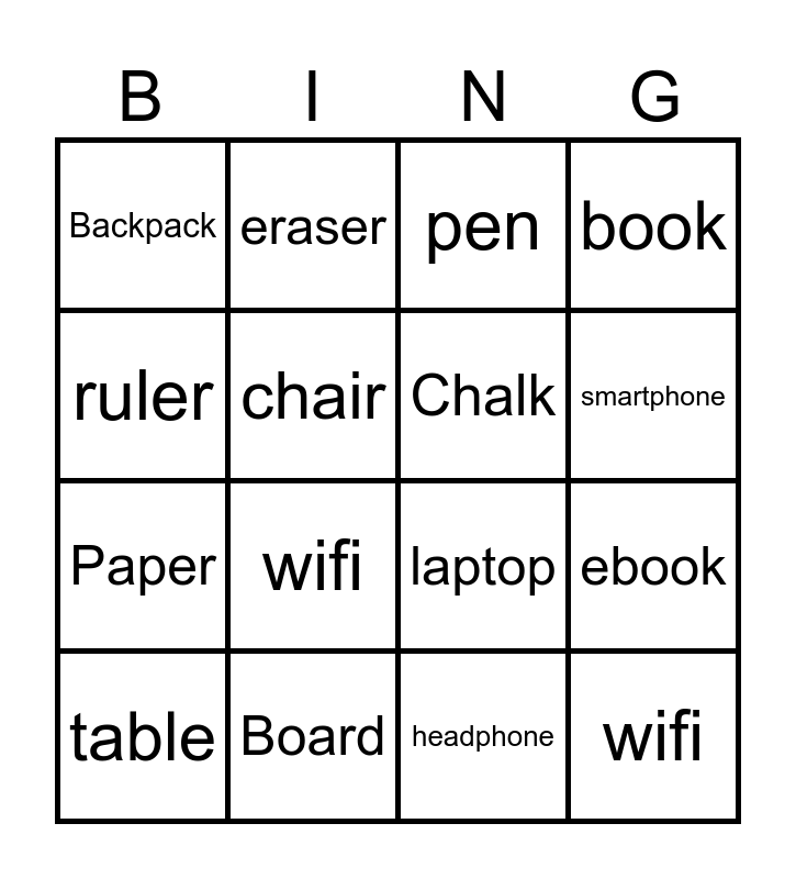 This bingo card has 17 words: headphone, table, pen, Backpack, wifi, book, ebook, Chalk, smartphone, chair, Board, laptop, ruler, eraser, Paper, webcam and wifi.
