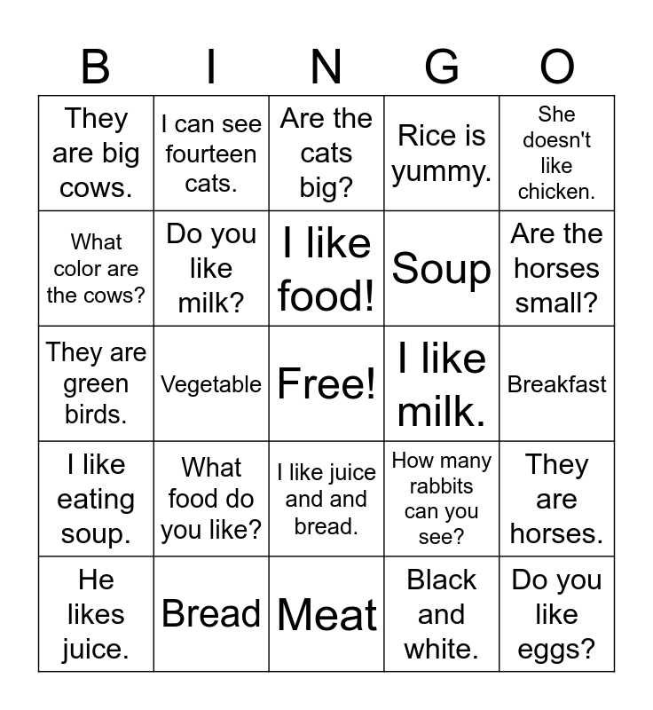 This bingo card has a free space and 24 words: What food do you like?, Bread, I like food!, He likes juice., She doesn't like chicken., They are big cows., What color are the cows?, I can see fourteen cats., I like milk., I like juice and and bread., Soup, They are green birds., How many rabbits can you see?, They are horses., Do you like milk?, Black and white., Breakfast, Are the cats big?, Are the horses small?, Vegetable, Do you like eggs?, I like eating soup., Rice is yummy. and Meat.