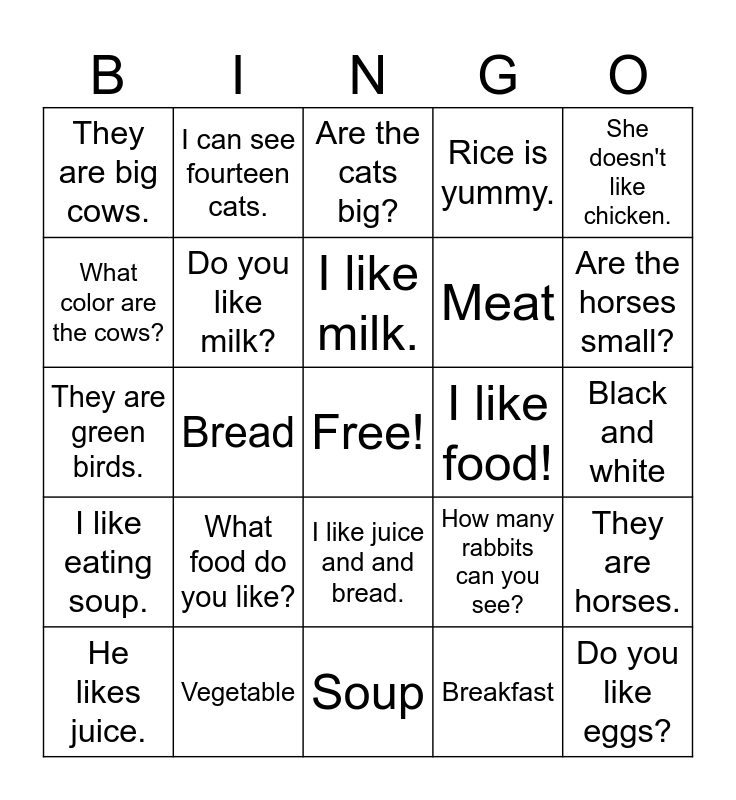 This bingo card has a free space and 24 words: What food do you like?, Vegetable, I like milk., He likes juice., She doesn't like chicken., They are big cows., What color are the cows?, I can see fourteen cats., I like food!, I like juice and and bread., Meat, They are green birds., How many rabbits can you see?, They are horses., Do you like milk?, Breakfast, Black and white, Are the cats big?, Are the horses small?, Bread, Do you like eggs?, I like eating soup., Rice is yummy. and Soup.