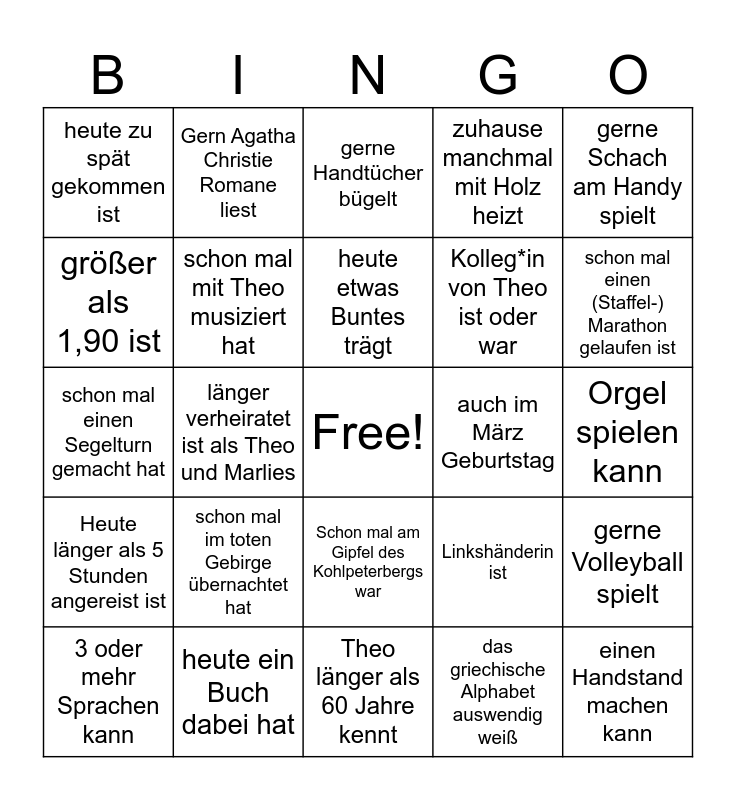 This bingo card has a free space and 25 words: schon mal im toten Gebirge übernachtet hat, Theo länger als 60 Jahre kennt, heute etwas Buntes trägt, 3 oder mehr Sprachen kann, gerne Schach am Handy spielt, heute zu spät gekommen ist, größer als 1,90 ist, Gern Agatha Christie Romane liest, auch im März Geburtstag, Schon mal am Gipfel des Kohlpeterbergs war, Kolleg*in von Theo ist oder war, schon mal einen Segelturn gemacht hat, Linkshänderin ist, gerne Volleyball spielt, schon mal mit Theo musiziert hat, dieses Jahr auch einen Runden hat, Orgel spielen kann, gerne Handtücher bügelt, schon mal einen (Staffel-) Marathon gelaufen ist, länger verheiratet ist als Theo und Marlies, einen Handstand machen kann, heute ein Buch dabei hat, Heute länger als 5 Stunden angereist ist, zuhause manchmal mit Holz heizt and das griechische Alphabet auswendig weiß.