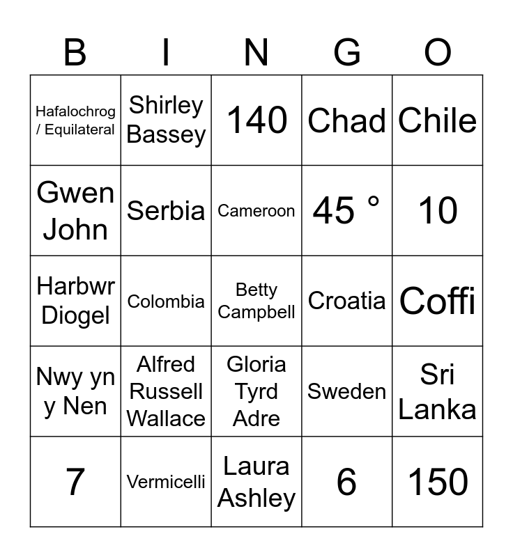 This bingo card has 51 words: Orig Williams, Betty Campbell, Ann Griffiths, Laura Ashley, Alfred Russell Wallace, Aneurin Bevan, Shirley Bassey, Billy Boston, Gwen John, Cranogwen / Sarah Jane Rees, Serbia, Chad, Sri Lanka, Sweden, Canada, Sbaen / Spain, Cameroon, Croatia, Swaziland, Chile, Colombia, 6, Hafalochrog / Equilateral, 45 °, 15, 150, 10, 50, 7, 140, 5, Almond, Caws, Marie Rose, Choux, Vermicelli, 0, Arth, Goulash, Ystlum, Coffi, Nwy yn y Nen, Nid Llwynog Oedd yr Haul, Y Cwm, Gwlad y Rasta Gwyn, Cerrig yr Afon, Harbwr Diogel, Oes Lle i Mi?, Fel Hyn Da Ni Fod, Gloria Tyrd Adre and Cân Wini.