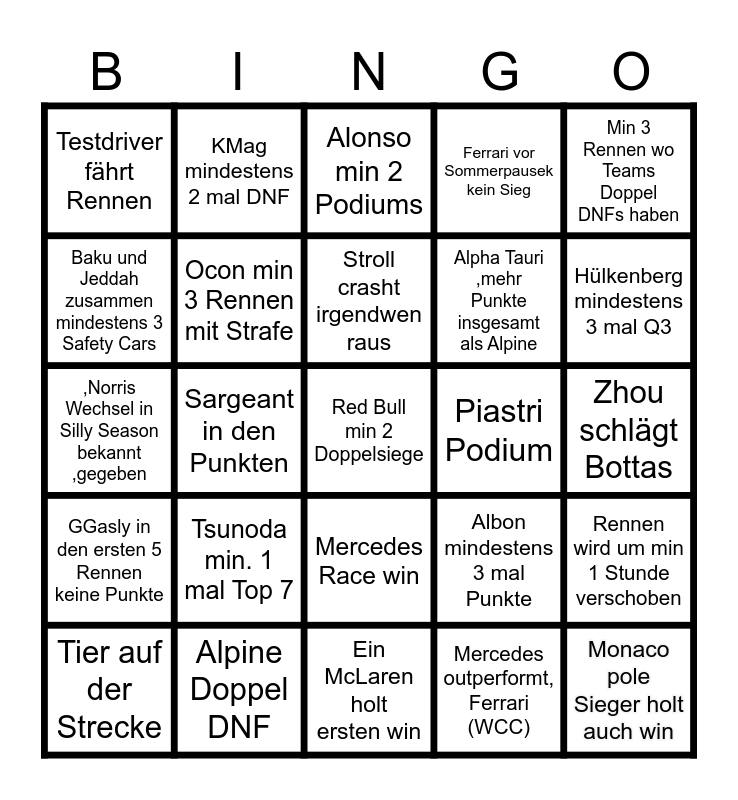 This bingo card has a free space and 24 words: Tsunoda min. 1 mal Top 7, Alpine Doppel DNF, Stroll crasht irgendwen raus, Tier auf der Strecke, Min 3 Rennen wo Teams Doppel DNFs haben, Testdriver fährt Rennen, Baku und Jeddah zusammen mindestens 3 Safety Cars, KMag mindestens 2 mal DNF, Piastri Podium, Mercedes Race win, Alpha Tauri ,mehr Punkte insgesamt als Alpine, ,Norris Wechsel in Silly Season bekannt ,gegeben, Albon mindestens 3 mal Punkte, Rennen wird um min 1 Stunde verschoben, Ocon min 3 Rennen mit Strafe, Mercedes outperformt, Ferrari (WCC), Zhou schlägt Bottas, Alonso min 2 Podiums, Hülkenberg mindestens 3 mal Q3, Sargeant in den Punkten, Monaco pole Sieger holt auch win, GGasly in den ersten 5 Rennen keine Punkte, Ferrari vor Sommerpausek kein Sieg and Ein McLaren holt ersten win.