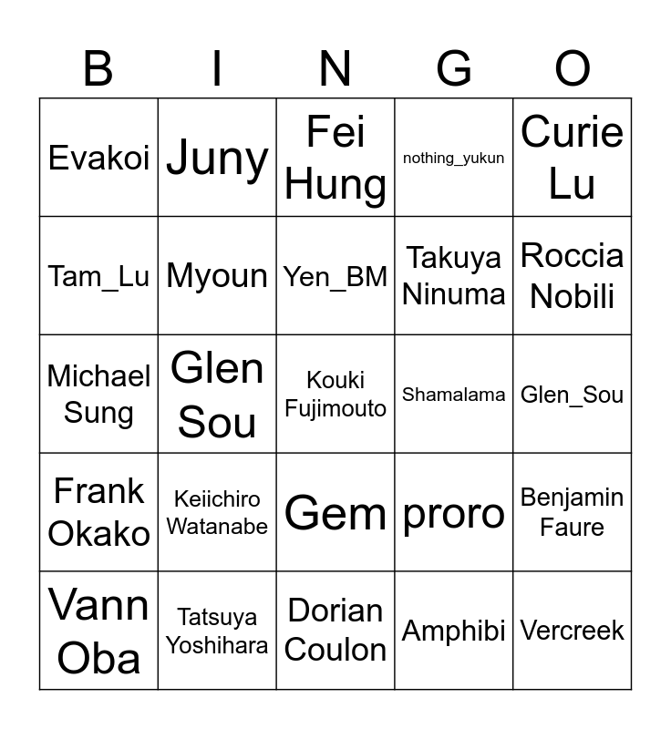 This bingo card has a free space and 24 words: Keiichiro Watanabe, Tatsuya Yoshihara, Yen_BM, Vann Oba, Curie Lu, Evakoi, Tam_Lu, Juny, Shamalama, Gem, Takuya Ninuma, Michael Sung, proro, Benjamin Faure, Myoun, Amphibi, Glen_Sou, Fei Hung, Roccia Nobili, Glen Sou, Vercreek, Frank Okako, nothing_yukun and Dorian Coulon.