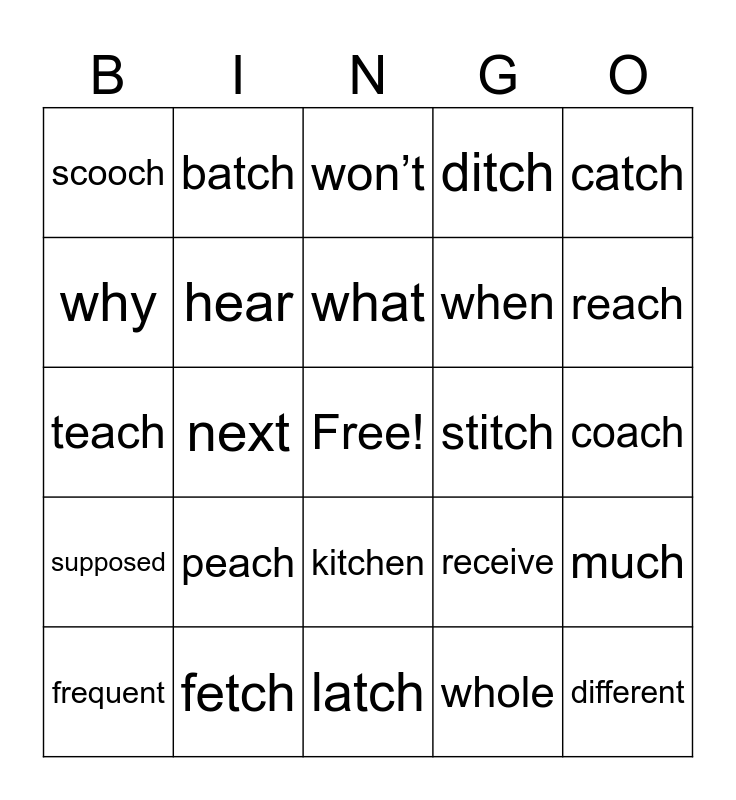 This bingo card has a free space and 43 words: yourself, different, doesn’t, frequent, weather, whole, won’t, match, catch, fetch, ditch, stitch, kitchen, peach, patch, latch, witch, teach, beach, reach, batch, itch, each, scooch, poach, coach, meant, against, receive, supposed, surprise, much, do, next, bye, for, who, what, why, when, where, hear and here.