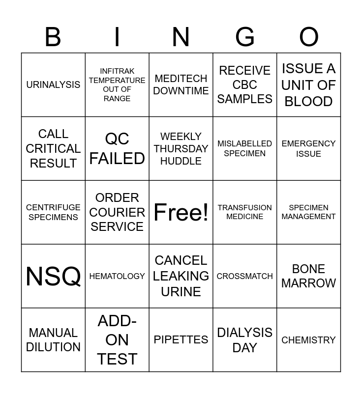 This bingo card has a free space and 40 words: STAT TROPONIN, CENTRIFUGE SPECIMENS, CALL SIEMENS FOR SERVICE, QC FAILED, ADD-ON TEST, CANCEL LEAKING URINE, WEEKLY THURSDAY HUDDLE, CSF NOTIFICATION, ISSUE A UNIT OF BLOOD, NSQ, ORDER COURIER SERVICE, RECEIVE CBC SAMPLES, CHEMISTRY, SPECIMEN MANAGEMENT, TRANSFUSION MEDICINE, HEMATOLOGY, CORE LAB, URINALYSIS, POSITIVE MALARIA, MEDITECH DOWNTIME, BONE MARROW, DIALYSIS DAY, MISLABELLED SPECIMEN, CALL CRITICAL RESULT, 24 HOUR URINE, CLOTTED SAMPLE, HEMOLYSED SAMPLE, ULTRACENTRIFUGE LIPEMIC SAMPLE, VENOUS BLOOD GAS, FIBRINOGEN NOTIFICATION, BODY FLUID, MANUAL DILUTION, TSF, CROSSMATCH, EMERGENCY ISSUE, PIPETTES, MAINTENANCE LOGS, HYGROMETER, INFITRAK TEMPERATURE OUT OF RANGE and APTIO LINE.
