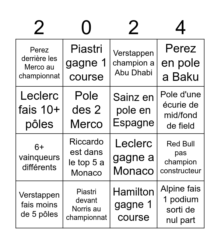 This bingo card has 16 words: Piastri devant Norris au championnat, Red Bull pas champion constructeur, Verstappen champion a Abu Dhabi, Perez derrière les Merco au championnat, 6+ vainqueurs différents, Piastri gagne 1 course, Leclerc gagne a Monaco, Hamilton gagne 1 course, Leclerc fais 10+ pôles, Pole des 2 Merco, Verstappen fais moins de 5 pôles, Perez en pole a Baku, Riccardo est dans le top 5 a Monaco, Pole d'une écurie de mid/fond de field, Sainz en pole en Espagne and Alpine fais 1 podium sorti de nul part.