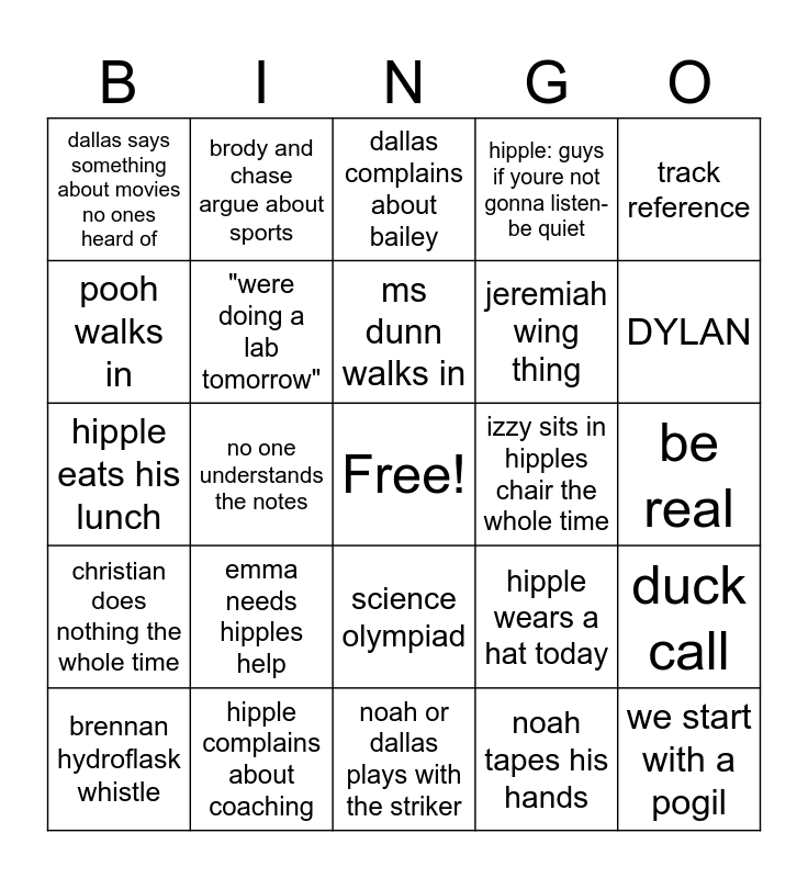 This bingo card has a free space and 28 words: duck call, jeremaih demonstrates how to do something, jeremiah wing thing, noah tapes his hands, pooh walks in, dallas complains about bailey, brody and chase argue about sports, christian does nothing the whole time, izzy sits in hipples chair the whole time, brennan hydroflask whistle, hipple eats his lunch, hipple: guys if youre not gonna listen- be quiet, hipple complains about coaching, noah or dallas plays with the striker, DYLAN, ava isnt here, emma needs hipples help, "were doing a lab tomorrow", ms dunn walks in, science olympiad, dallas says something about movies no ones heard of, starwars, we start with a pogil, no one understands the notes, be real, hipple wears a hat today, track reference and carter comes in.