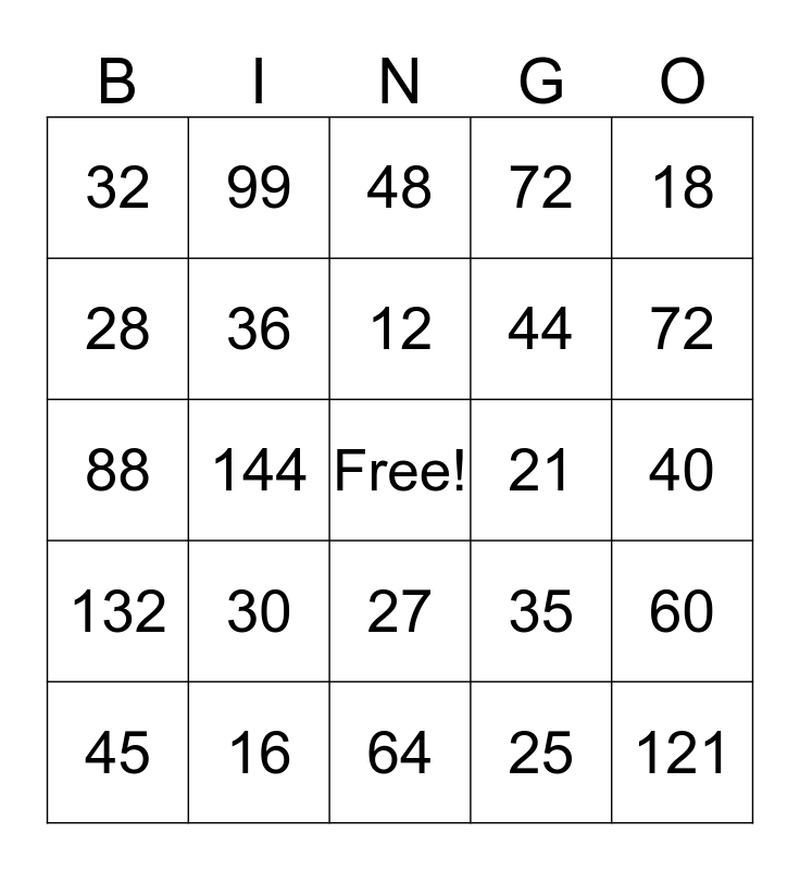 This bingo card has a free space and 24 words: 30, 16, 12, 45, 18, 32, 28, 99, 21, 27, 44, 88, 35, 60, 36, 25, 40, 48, 72, 144, 121, 132, 72 and 64.