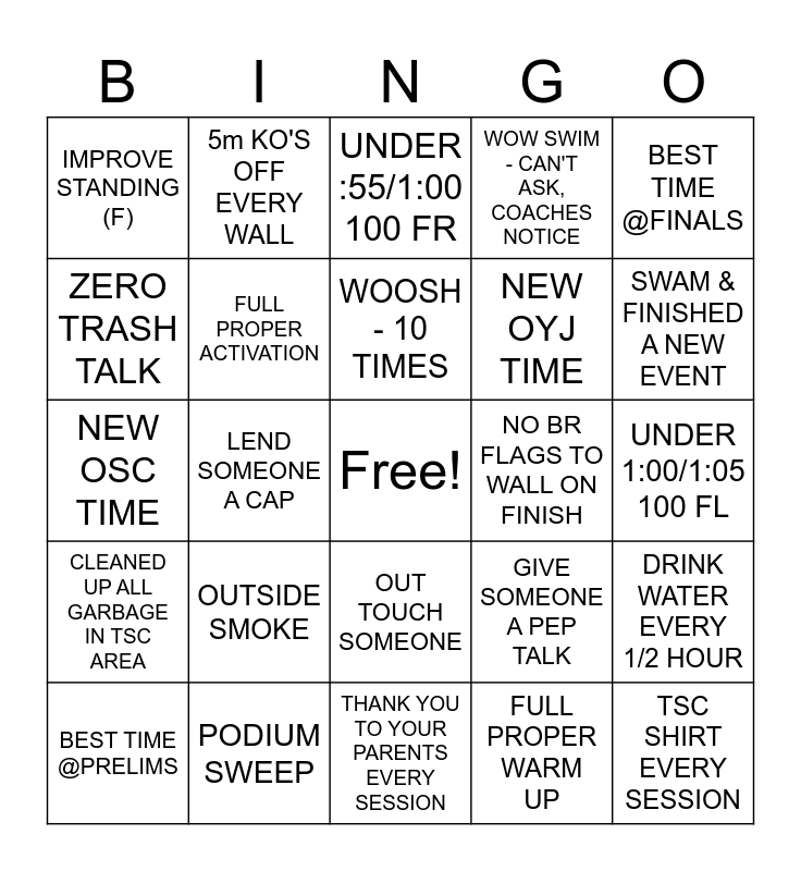 This bingo card has a free space and 24 words: OUTSIDE SMOKE, PODIUM SWEEP, WOOSH - 10 TIMES, BEST TIME @PRELIMS, BEST TIME @FINALS, IMPROVE STANDING (F), ZERO TRASH TALK, 5m KO'S OFF EVERY WALL, NO BR FLAGS TO WALL ON FINISH, OUT TOUCH SOMEONE, NEW OYJ TIME, NEW OSC TIME, GIVE SOMEONE A PEP TALK, DRINK WATER EVERY 1/2 HOUR, FULL PROPER ACTIVATION, FULL PROPER WARM UP, UNDER 1:00/1:05 100 FL, UNDER :55/1:00 100 FR, SWAM & FINISHED A NEW EVENT, LEND SOMEONE A CAP, TSC SHIRT EVERY SESSION, CLEANED UP ALL GARBAGE IN TSC AREA, WOW SWIM - CAN'T ASK, COACHES NOTICE and THANK YOU TO YOUR PARENTS EVERY SESSION.