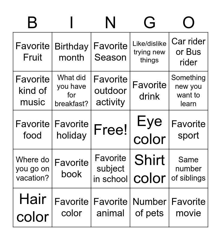 This bingo card has a free space and 24 words: Favorite book, Favorite color, Favorite outdoor activity, Hair color, Car rider or Bus rider, Favorite Fruit, Favorite kind of music, Birthday month, Eye color, Favorite subject in school, Favorite drink, Favorite food, Shirt color, Same number of siblings, What did you have for breakfast?, Number of pets, Favorite sport, Favorite Season, Something new you want to learn, Favorite holiday, Favorite movie, Where do you go on vacation?, Like/dislike trying new things and Favorite animal.