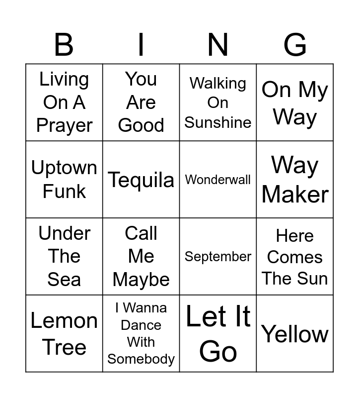 This bingo card has 37 words: I want it that way, Gimme! Gimme! Gimme!, Breakfast At Tiffany's, Wonderwall, Praise, Seen, Way Maker, Eye of the Tiger, Uptown Funk, Happy, Here Comes The Sun, On My Way, Lemon Tree, Let It Go, Tequila, Yellow, Mamma Mia, Walking On Sunshine, Africa, I Wanna Dance With Somebody, Living On A Prayer, Call Me Maybe, Party In The USA, Perfect, Bohemian Rhapsodie, Final Countdown, You Are Good, Amazing Grace, Church Clap, Escape (The Pina Colada Song), 9 To 5, I'm A Believer, September, 99 Luftballons, Cotton Eye Joe, Under The Sea and Hakuna Matata.