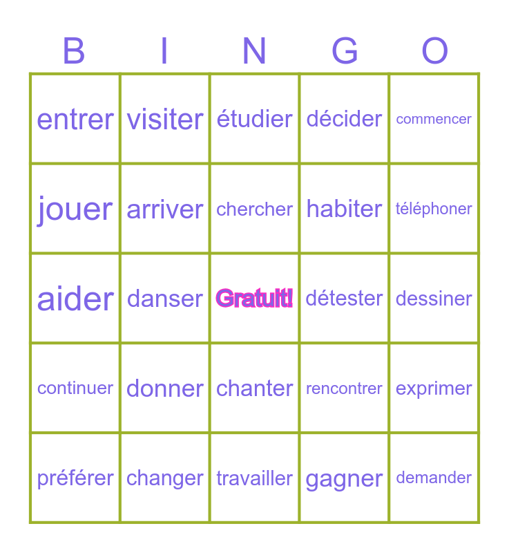 This bingo card has a free space and 40 words: adorer, aider, aimer, arriver, changer, chanter, chercher, commander, commencer, continuer, danser, décider, demander, dessiner, détester, donner, écouter, entrer, essayer, étudier, exprimer, gagner, habiter, jouer, manger, marcher, nager, organiser, parler, penser, porter, préférer, regarder, rencontrer, téléphoner, travailler, trouver, utiliser, visiter and voyager.