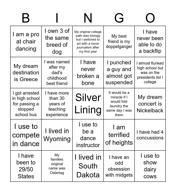 This bingo card has a free space and 29 words: I have been to 29/50 States, I am Canadian, I have more than 30 years of teaching experience, My least favorite color is purple, I am a pro at chair dancing, My original college path was biology but I switched to art with a minor journalism after my first year, I was named after my dad's childhood best friend, I lived in Wyoming, It would be a miracle if I would fold laundry the same day I was them, My families original name was Ostertag, My dream concert is Nickelback, I use to show dairy cows, I lived in South Dakota, I have an odd obsession with midgets, I almost flunked high school but was on the presidents list I college, My middle name was actually going to be my first name, I use to be a dance instructor, I use to compete in dance, I have never been able to do a backflip, I got arrested in high school for passing a stopped school bus, I am terrified of heights, I have had more cars than years I have been alive, I punched a guy and almost got suspended, My dream destination is Greece, My best friend is my doppelganger, I own 3 of the same breed of dog, I have had 4 concussions, I have never broken a bone and I love to water Ski.